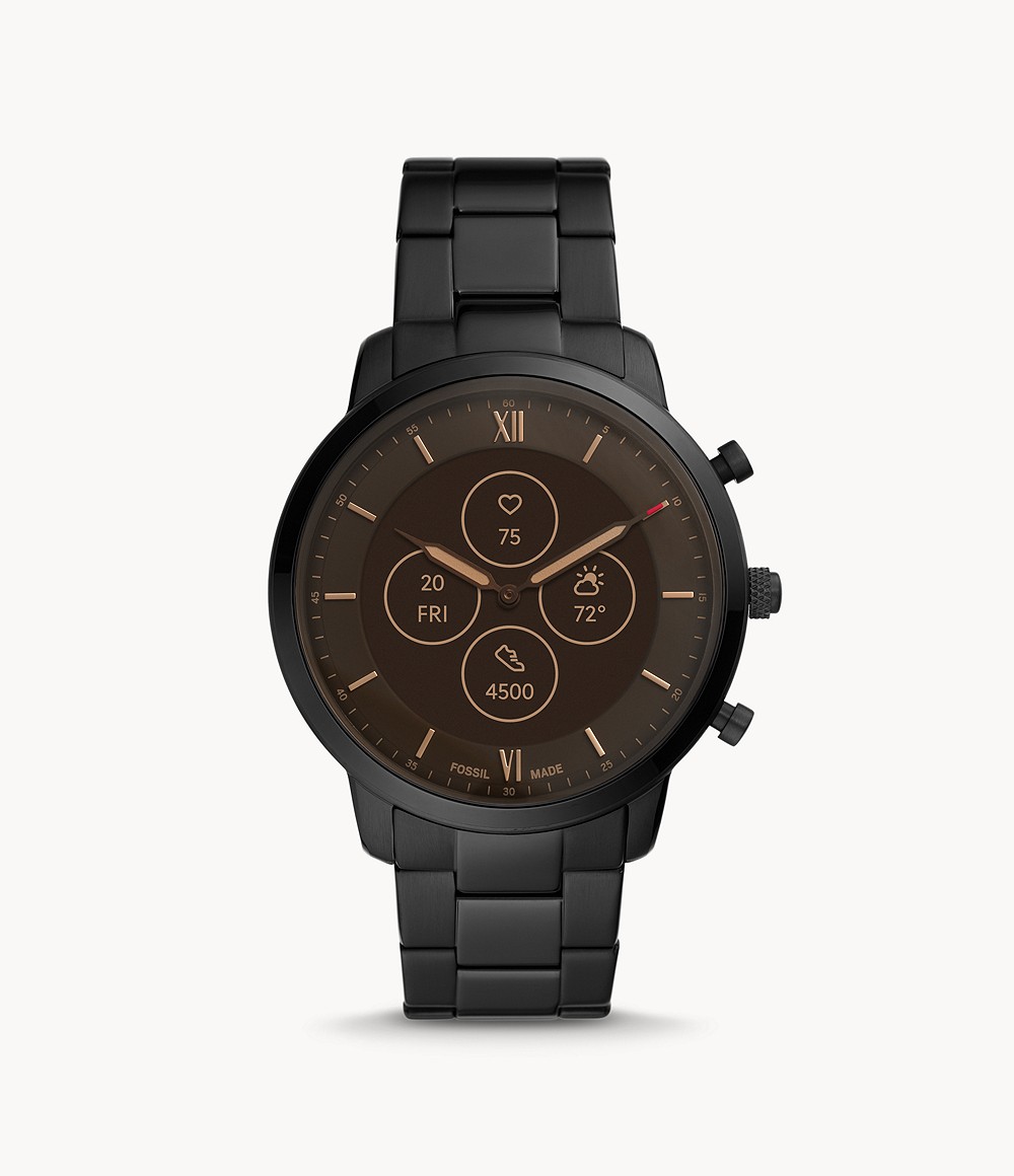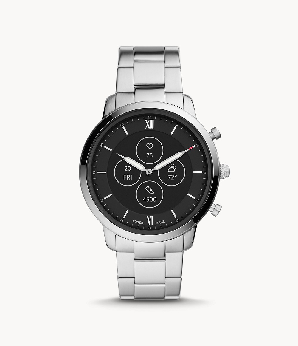 Fossil Neutra Smartwatch ibrido HR presenta una cassa in acciaio inossidabile rotonda da 45 mm di diametro e 14 mm di spessore, con cinturino intercambiabile largo 22 mm. E' stato lanciato sul mercato in quattro varianti, di cui due con bracciale in acciaio inossidabile e due con cinturino in pelle.